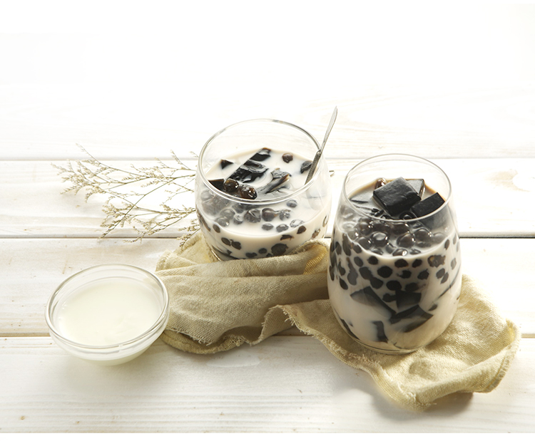 2、 最后將調(diào)好的奶茶倒入即可做成一杯美味可口的燒仙草三兄弟。