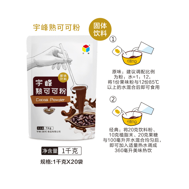 1.先用熱水150ml將35g宇峰可可粉充分?jǐn)嚢杈鶆颍瑹o(wú)顆粒呈現(xiàn),然后倒入冰塊150g降溫